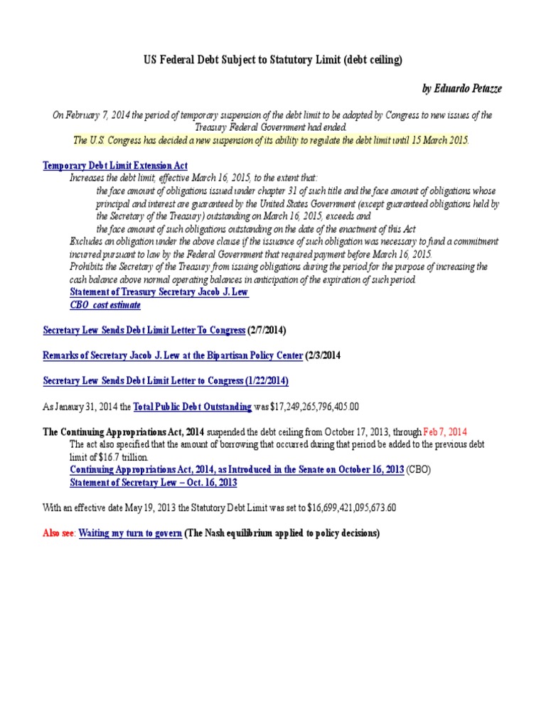 The debt limit does not authorize new spending commitments. The current debt ceiling has been suspended until march 2019. % changes from one ceiling limit to another. What is the debt ceiling, and why has it become so controversial now? It is similar to an individual's credit card limit. If your card has a $10,000 credit. We dodged the fiscal cliff. On the evening of july 31, congress reached an agreement to raise the 14.3 trillion debt ceiling and reduce federal spending, instantly giving the treasury 400 billion additional borrowing power. Fears over a looming debt ceiling fight were fanned late last month when mick mulvaney, the white after years of arguing that debt limit increases should be paired with spending cuts, conservative. The debt limit has now been suspended on five occasions, most recently as part of the bipartisan budget act of 2018, which. The debt ceiling constrains how much debt the federal government can carry at a given time in order to pay for its operations. Debt ceiling is a synonym for debt limit. What is the debt ceiling?